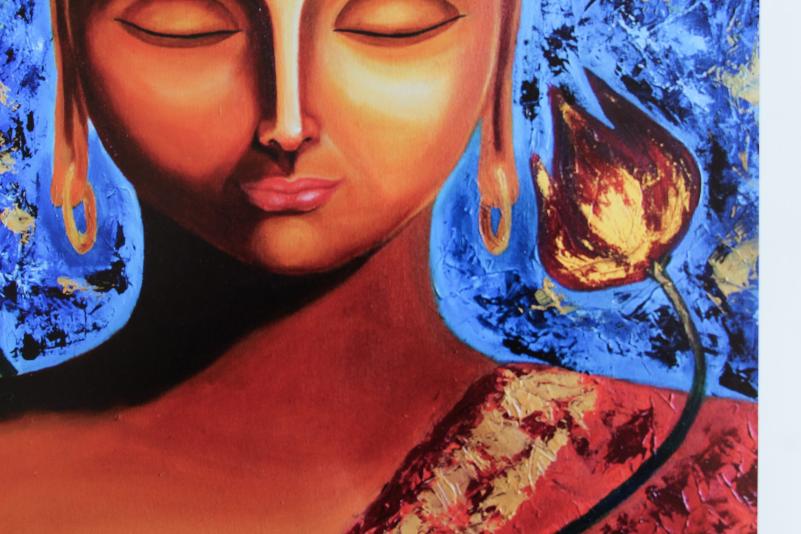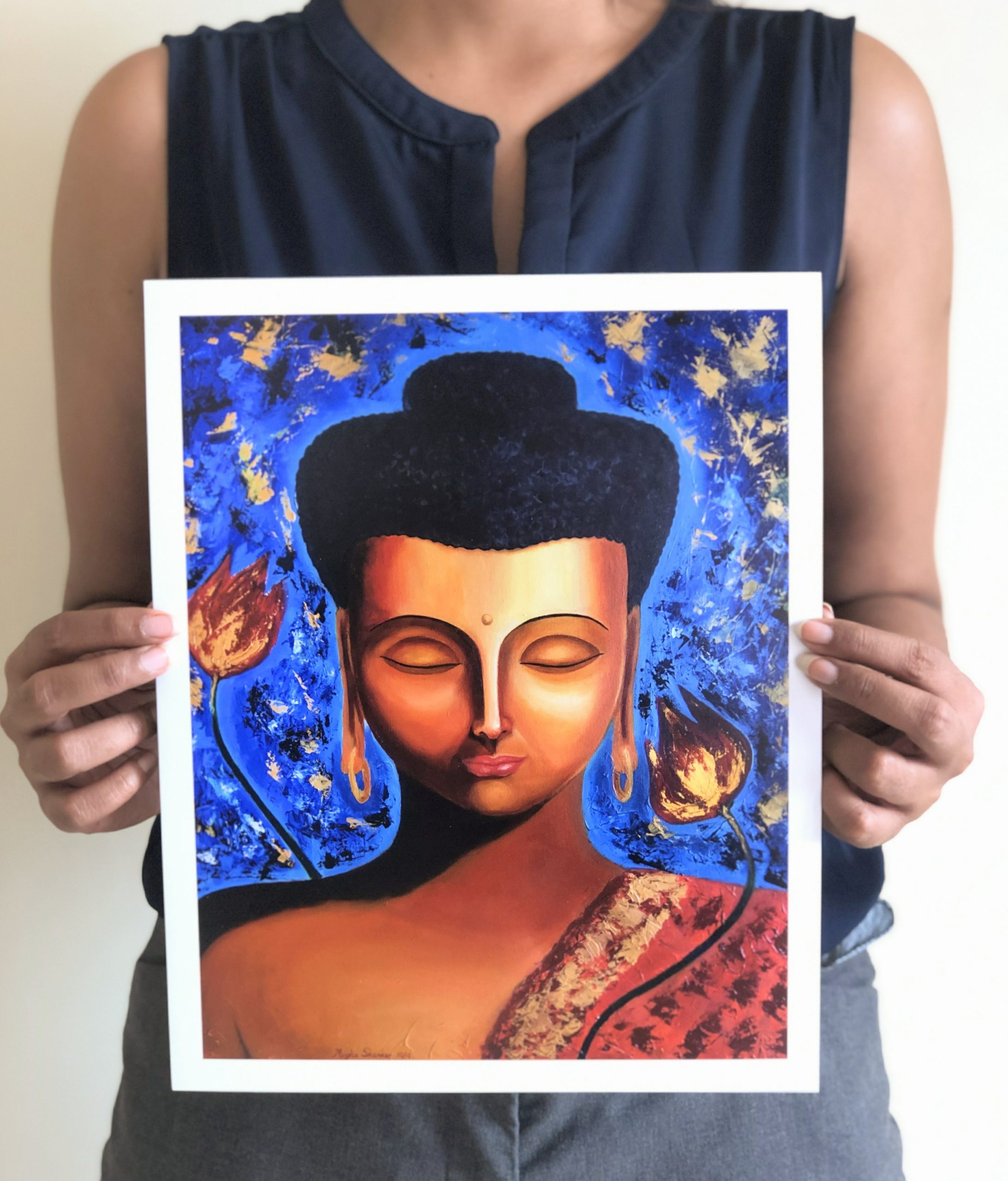 Fine art print of the original artwork ‘Equanimity’ expresses Buddha’s equanimity amidst chaos and clutter using a variety of warm and cool tones.