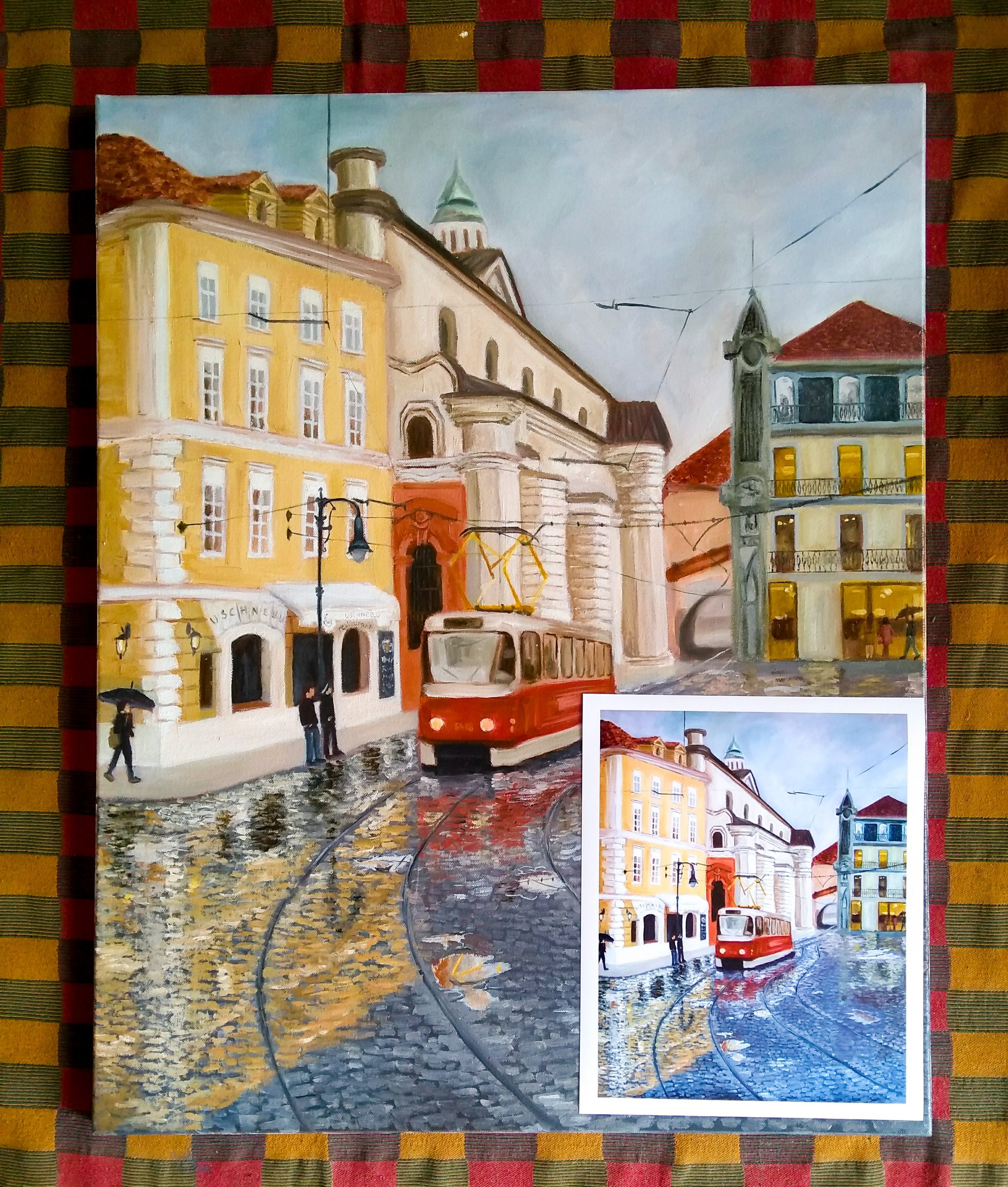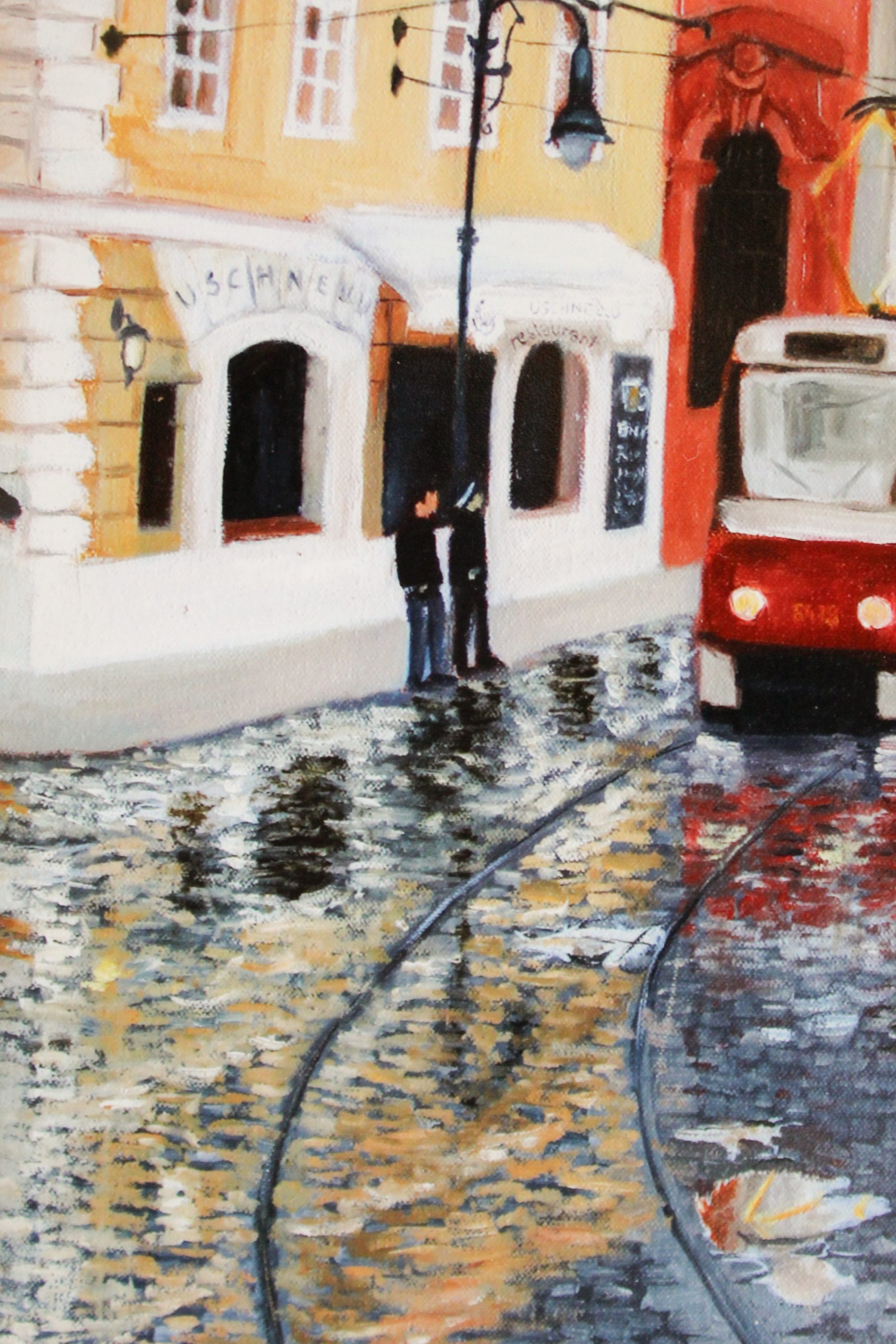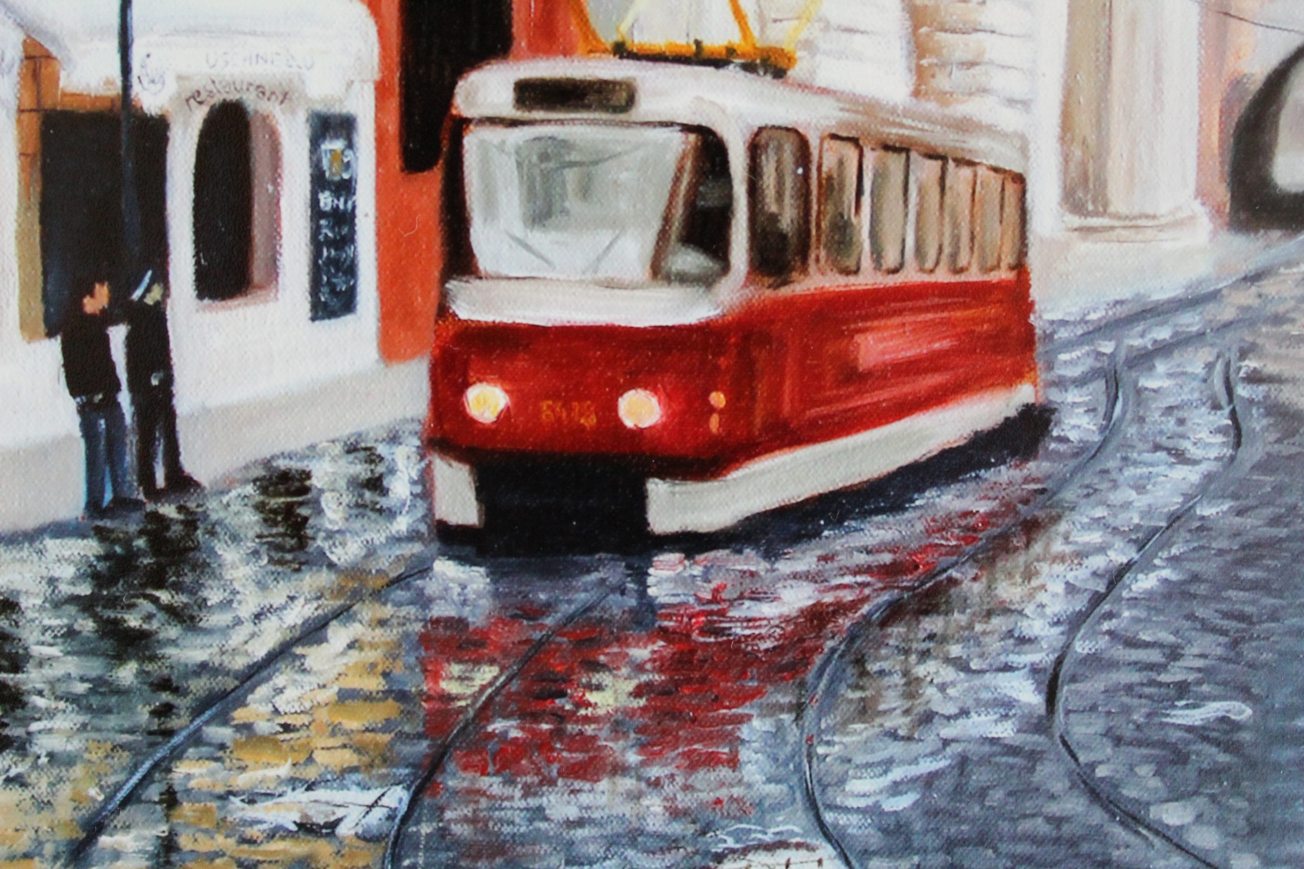 Fine art print of the original artwork ‘Rainy Day in Prague’ portrays the buzzing, colourful city life amidst the historic, baroque architecture in Prague in an impressionistic style.