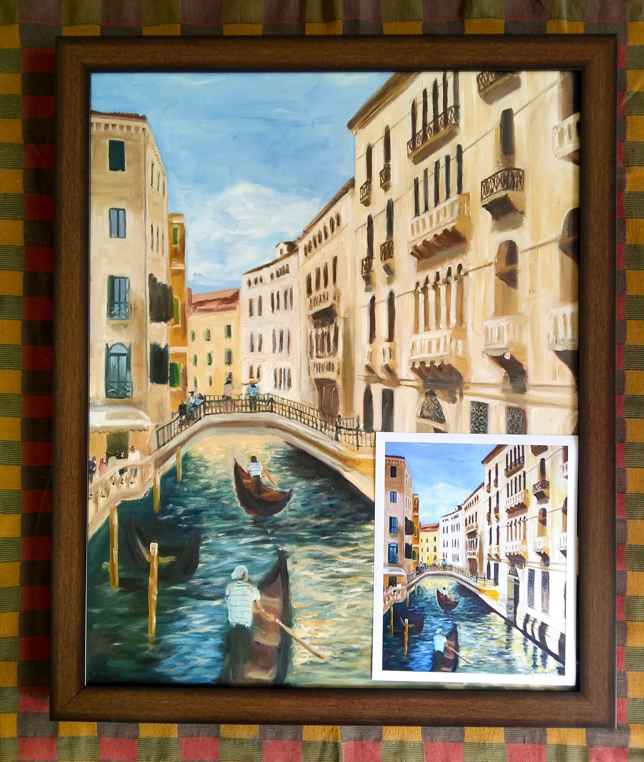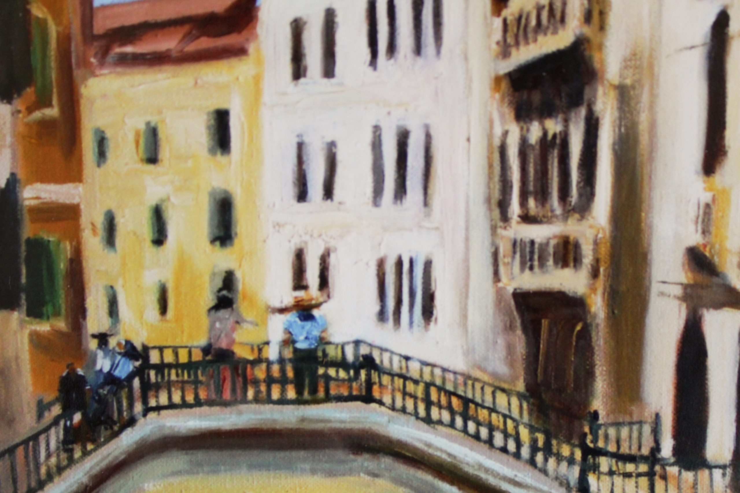 Fine art print of the original artwork ‘Venice’ portrays the breathtaking architecture, hustling tourists, boats, bridges and the magnificent canal of Venice in an Impressionistic style.