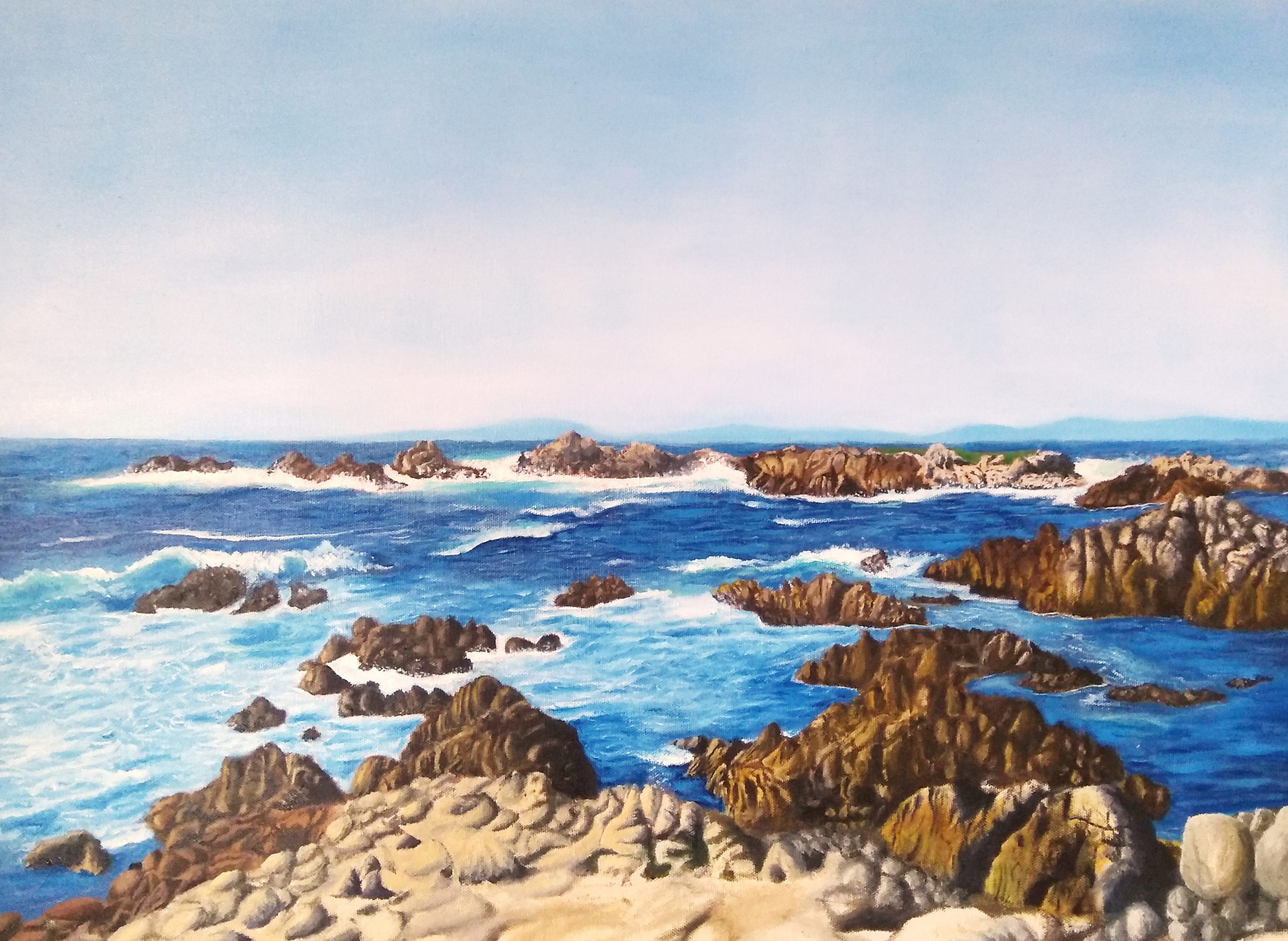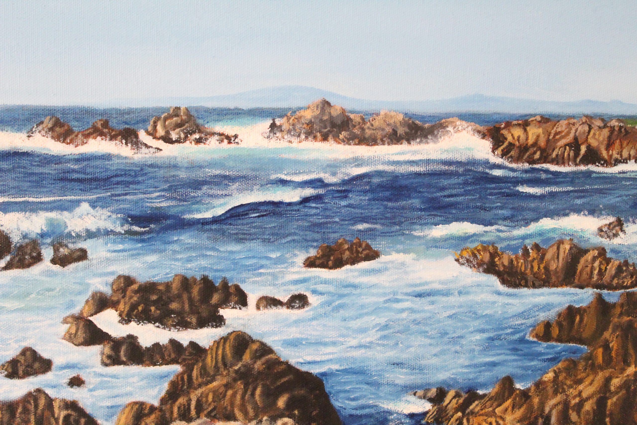 Waves perfectly sum up the ancient quote: ‘Change is the only constant’. Painted in a realistic style, ‘Impermanence’ explores the harmonious coexistence of two contradicting elements of nature; the ever changing movement of water against the firm and immovable rocks. This original signed oil painting on canvas board measures 18×24 inches.