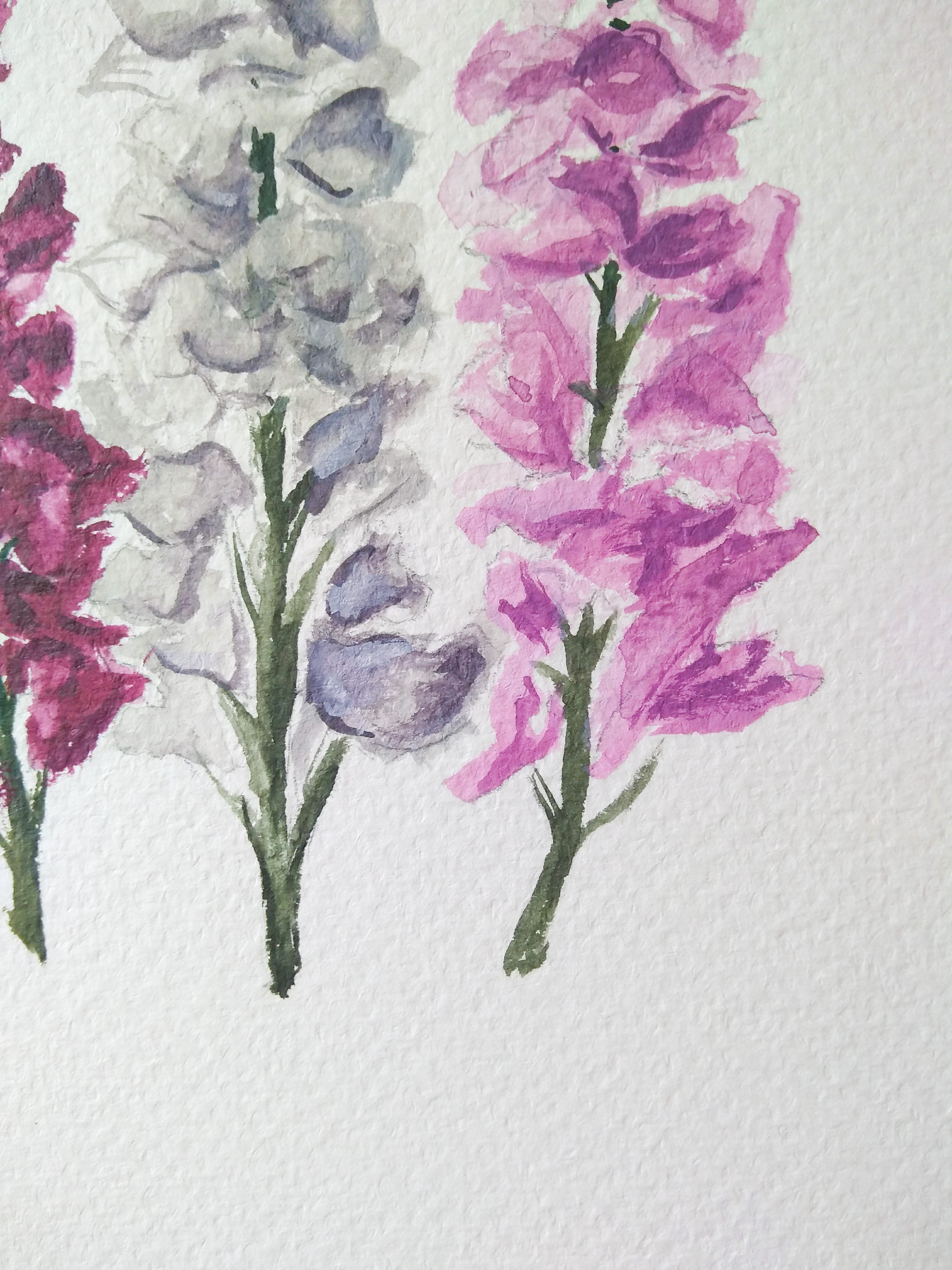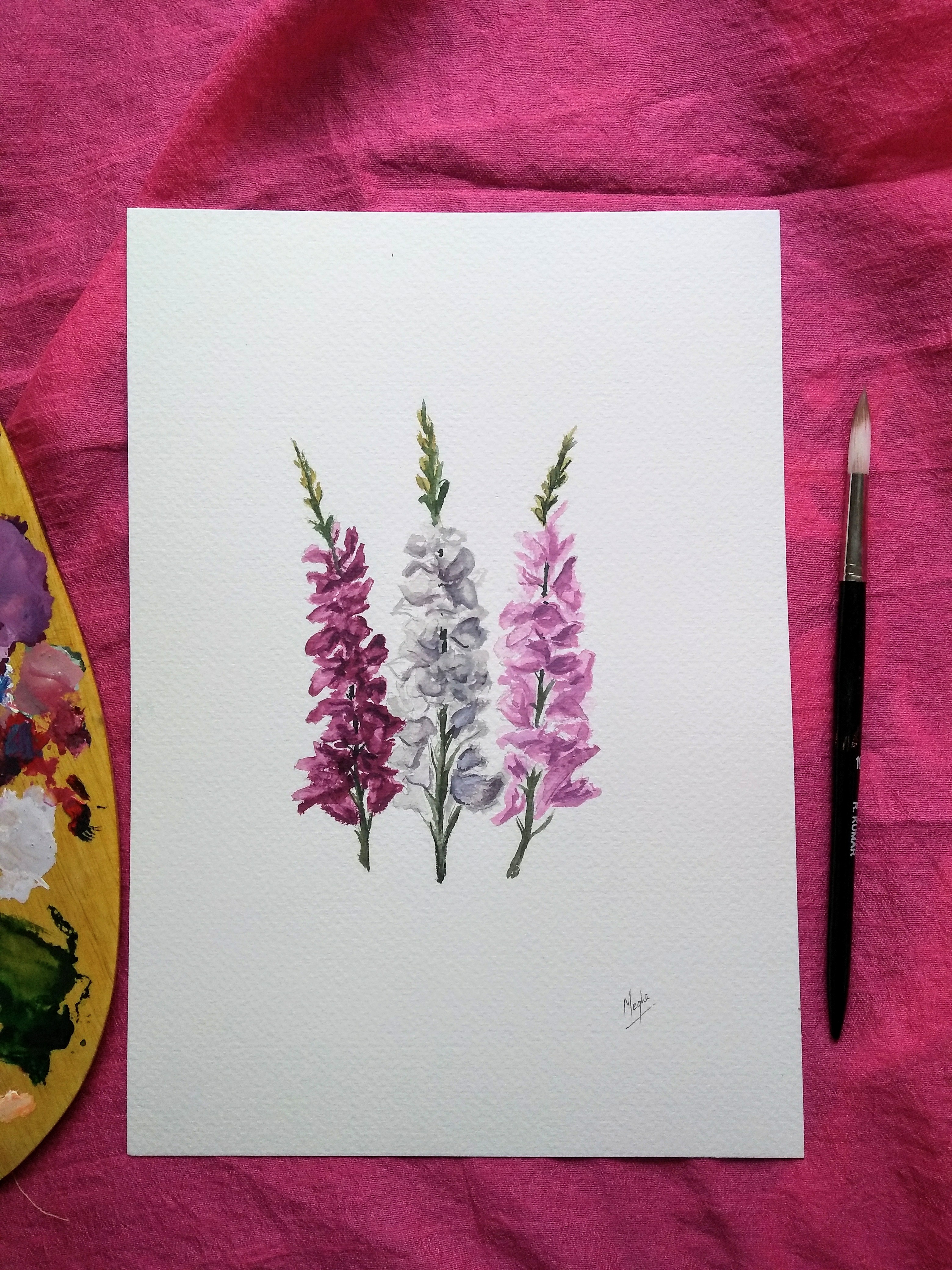 Painted on a 300gsm premium cold pressed watercolor paper, this botanical illustration portrays the elegant snapdragon flower. Available in a ready to hang wooden frame with glass. Measures 9×12.5 inches with the frame and 8×11.5 inches unframed. Signed by the artist.